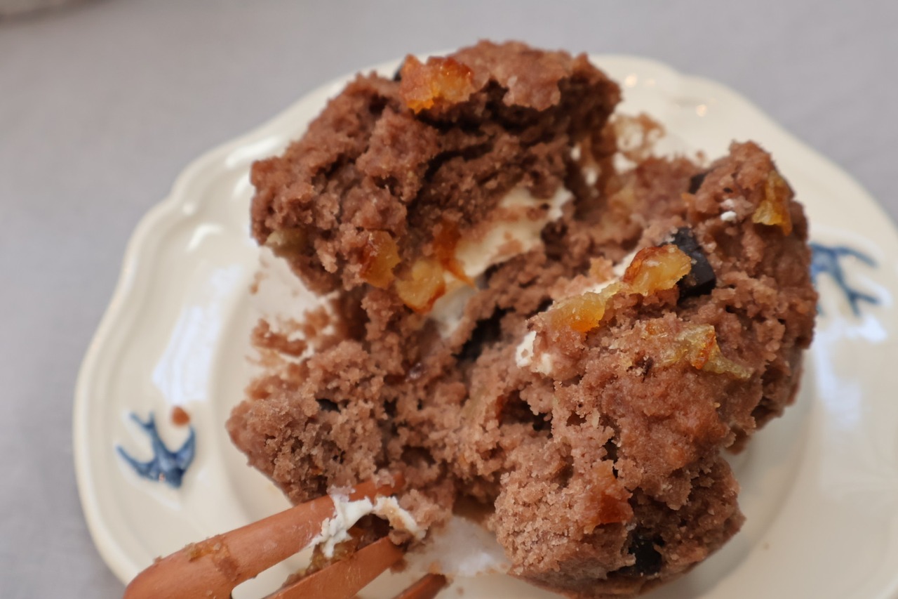 ショコラ生地にチョコレート、オレンジピールをたっぷりと混ぜ込み、クセのないミルキーな味わいの北海道産クリームチーズを入れたこの時期限定の贅沢な味わいのマフィン。